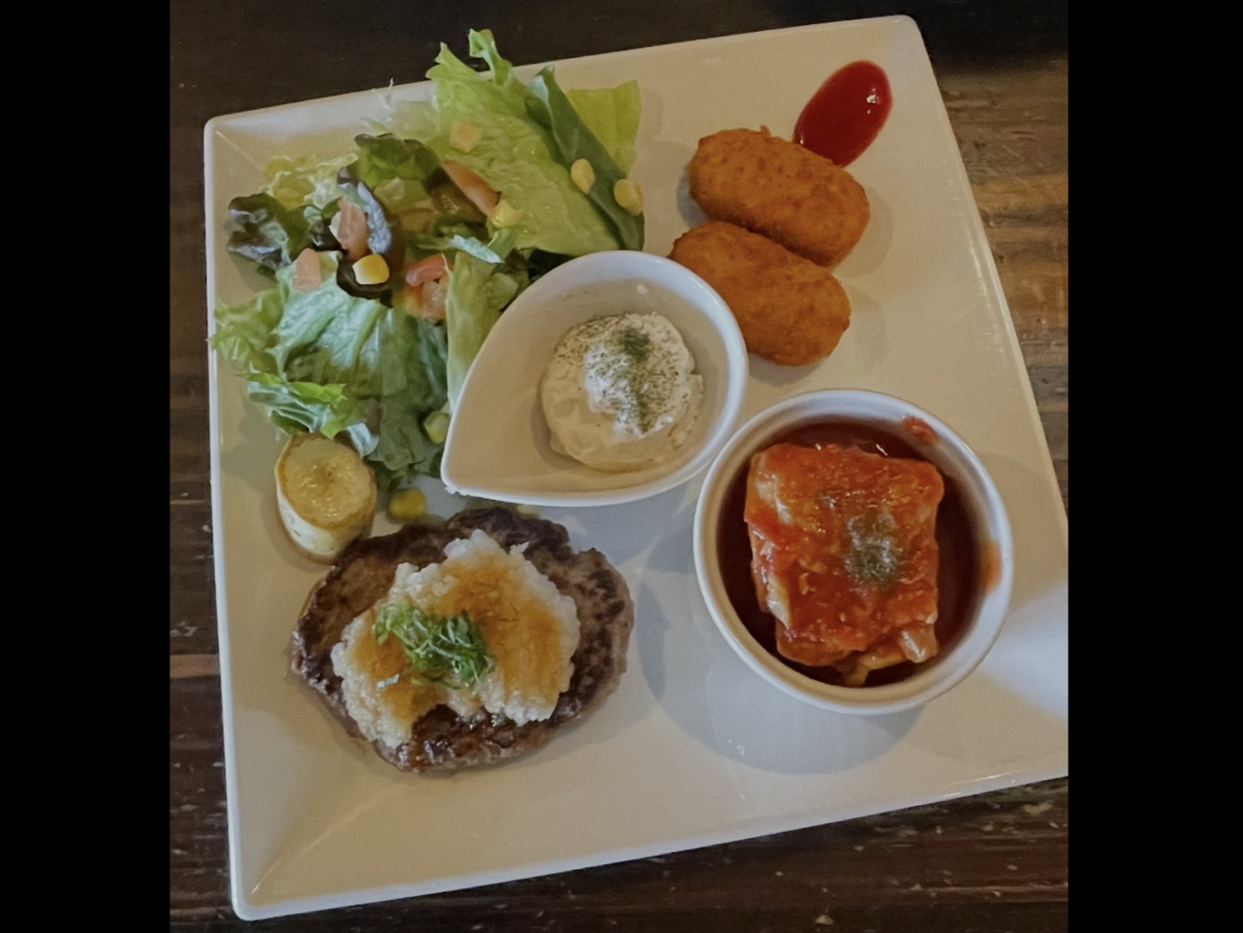 和風おろしハンバーグ&チキンのトマト煮&ポテトサラダ&カニクリームコロッケ